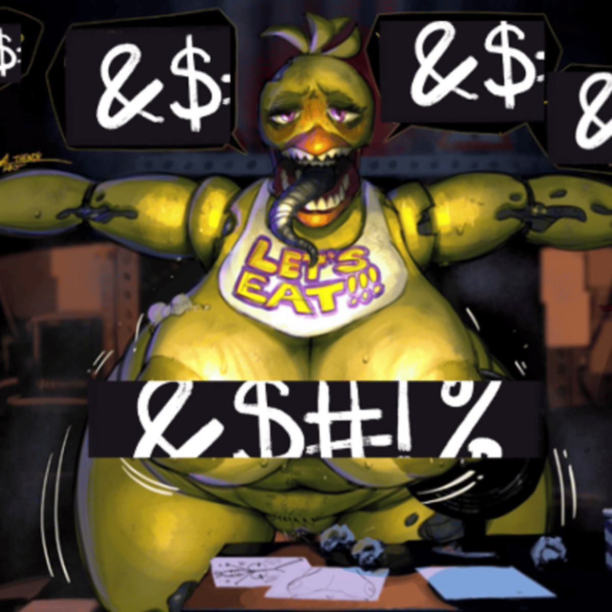 A yellow animatronic bird with a tattered bib that says "Let's Eat!!!". She sits in a dimly lit office, damaged and unsettling, with an aggressive posture. (Artist: Thendyart)