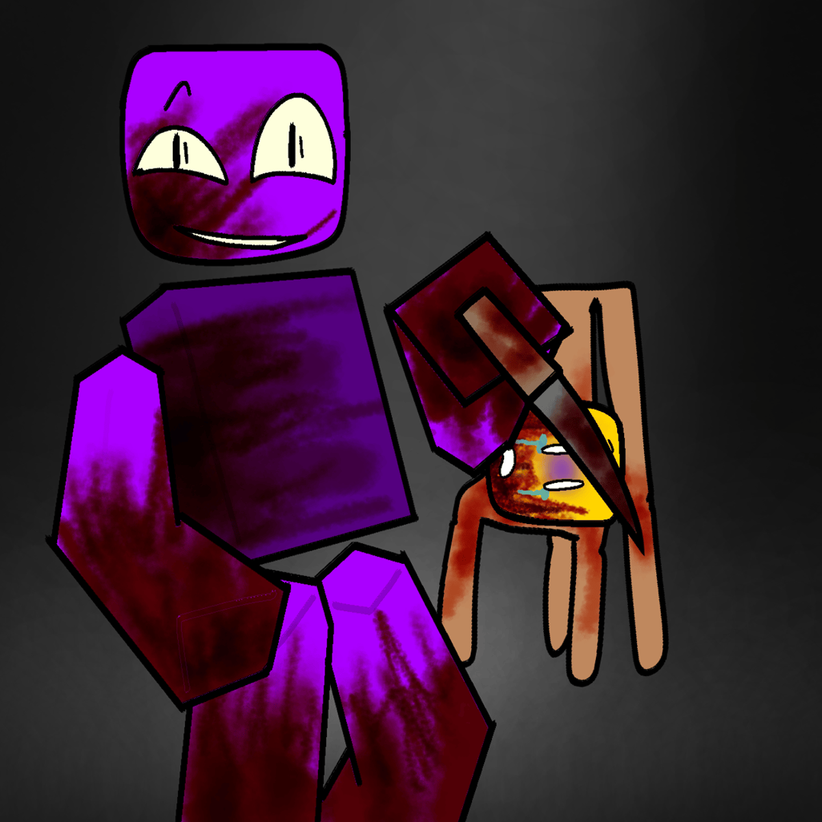You were just chillin in robloxia until you walked into a dimly lit room in a castle to see saint your kindergartner friend that got bullied he's turned crazy, you see saint all bloody and noobs head detached on the chair, what is your next move? (Note: this is my Roblox oc)